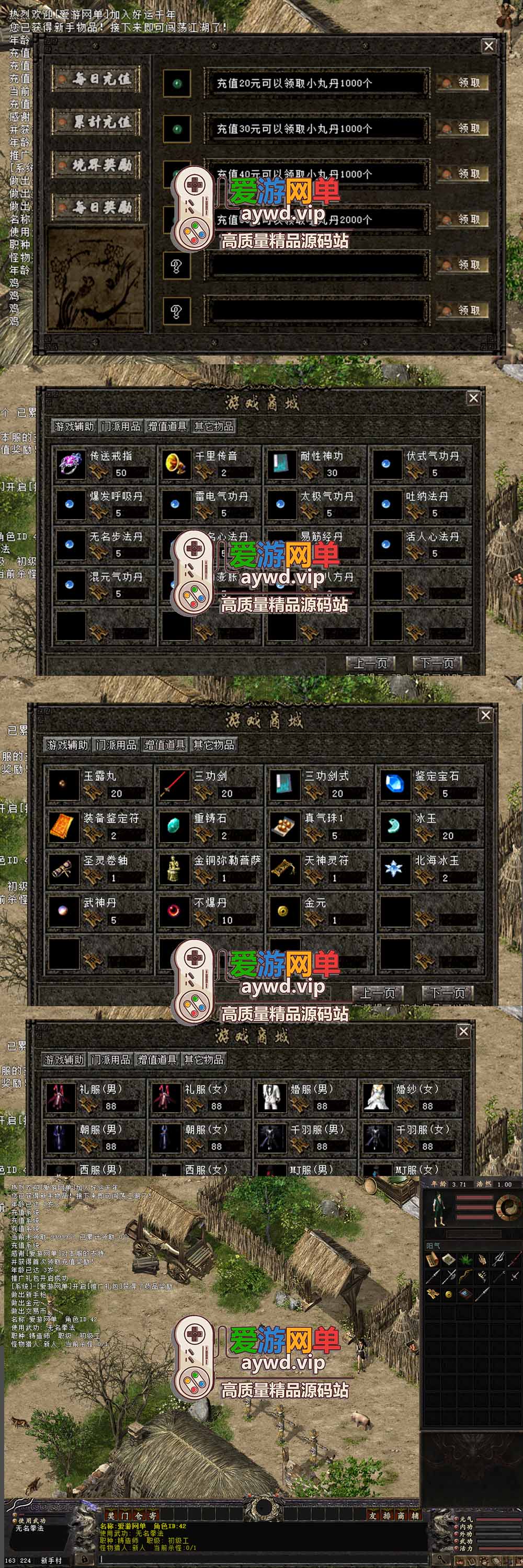 新人村出生附送一层武功全套,做完新手任务得到船票即可出村,所得首饰饰品均可升级